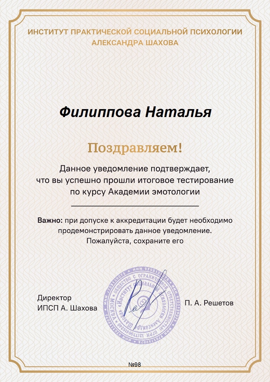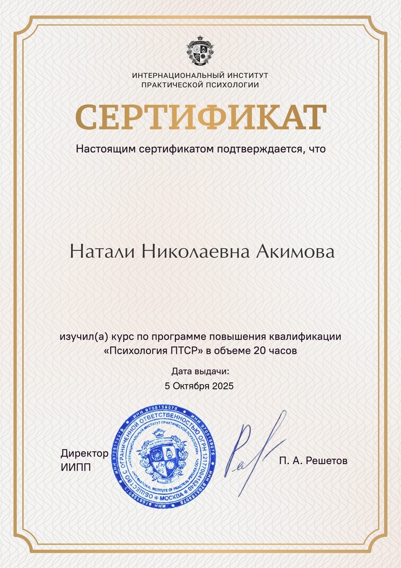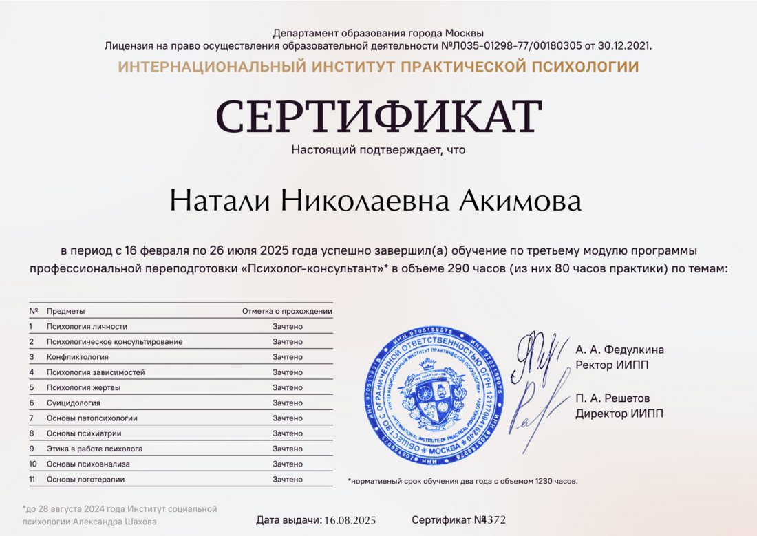 Психология - это мой третий диплом, и это не просто очередная профессия, это моя миссия привести людей к счастью. Я не останавливаюсь в своем развитии. Я продолжаю свою личную терапию, посещаю супервизии, посещаю разные мастер классы, тренинги, хожу на нетворкинги, создала свои тренинги и марафоны. Создала девичники в г. Краснодар где девушки находят подруг и единомышленников. Моему развитию нет предела, и от этого я получаю огромное удовольствие!