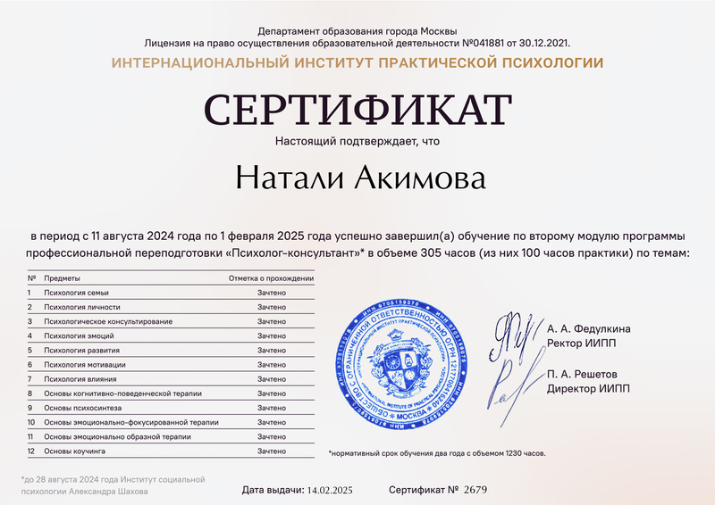 Благодаря знаниям и огромному опыту, я уверенно привожу клиентов к той жизни о которой они мечтают! Это не пустые разговоры, это не просто выслушать, это четкие действия которые приводят к результату. Я не копаюсь в прошлом, в маме и папе, мы работаем на всех уровнях одновременно, что дает отличный результат за короткие сроки!