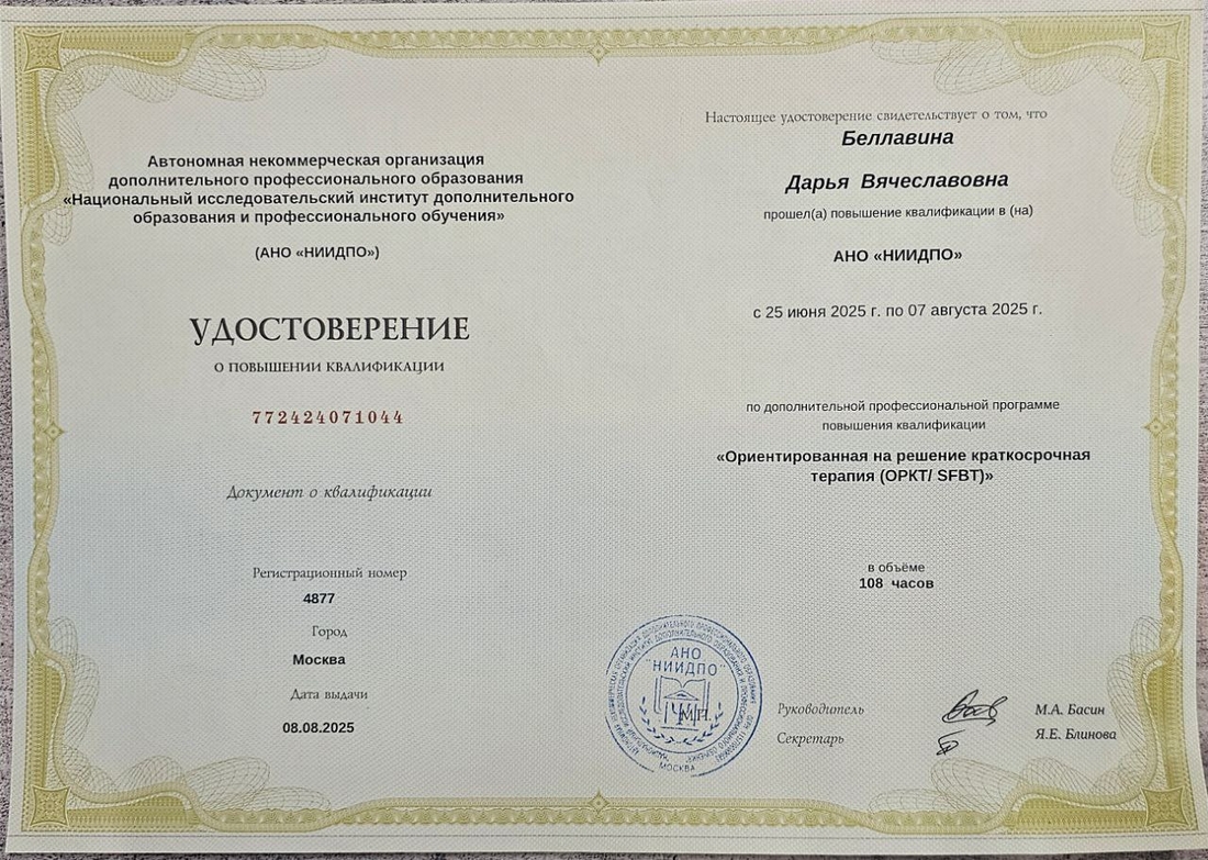 В работе также использую ориентированную на решение краткосрочную терапию. Этот подход фокусируется не столько на подробном анализе проблемы, сколько на поиске ресурсов, возможностей и шагов, которые помогают человеку двигаться к желаемым изменениям.