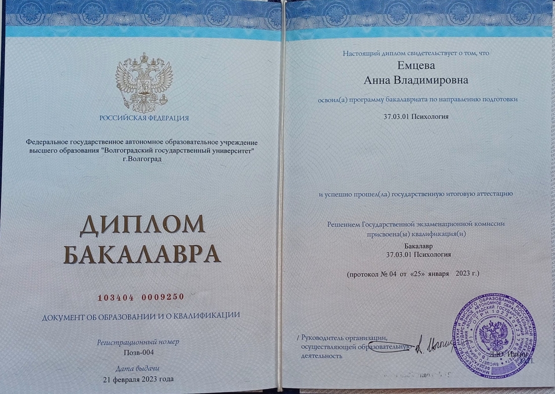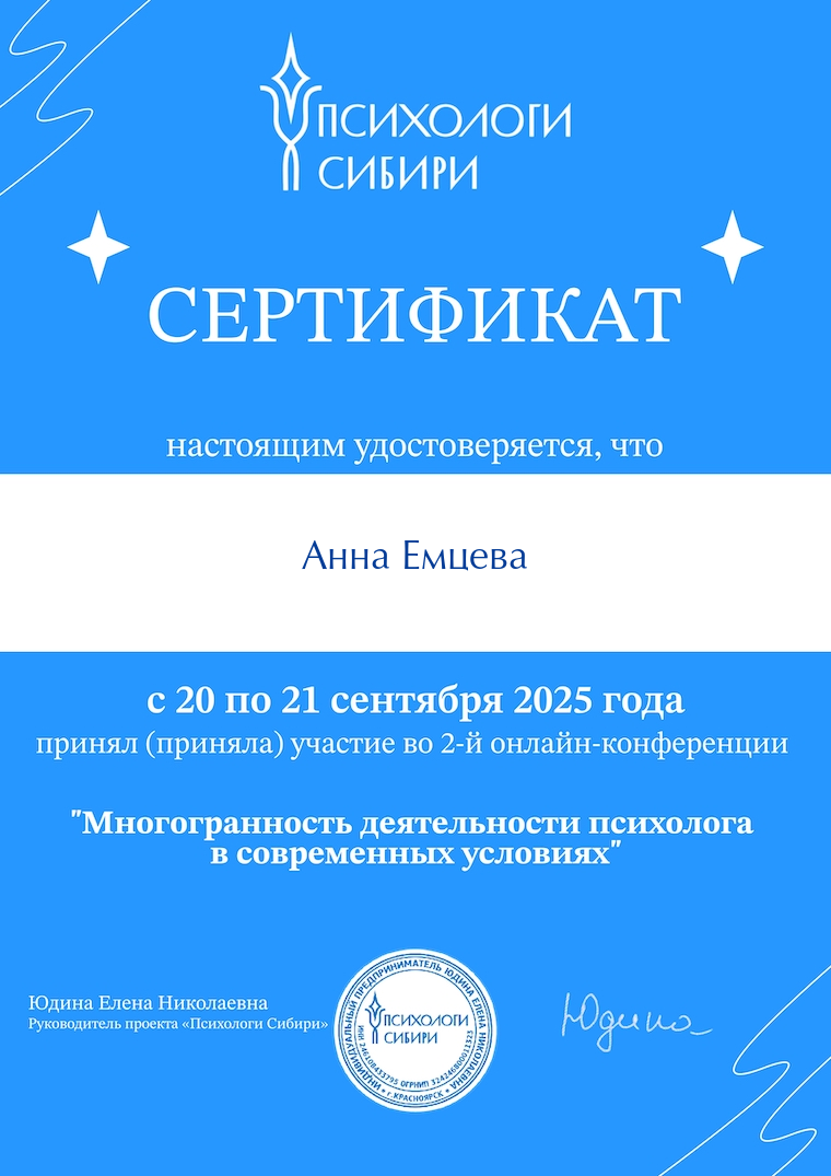 Было время, когда я сама обращалась за психологической помощью. И эта профессия меня очень увлекла, буквально влюбила в себя. Имею базовое образование, бакалавриат. Продолжаю учиться, изучать новое.
