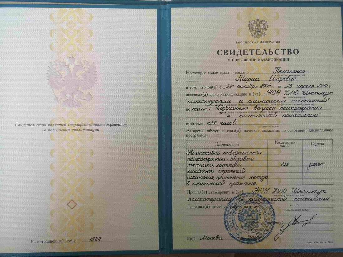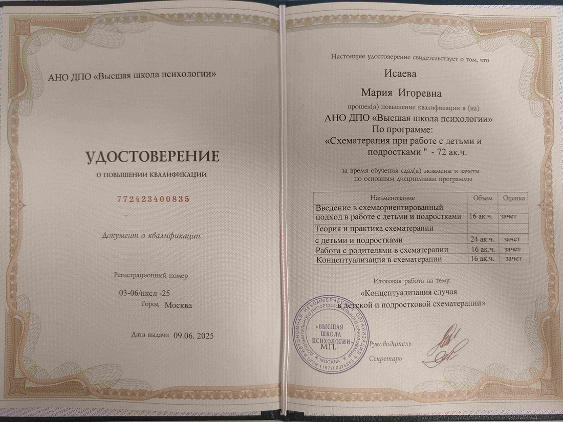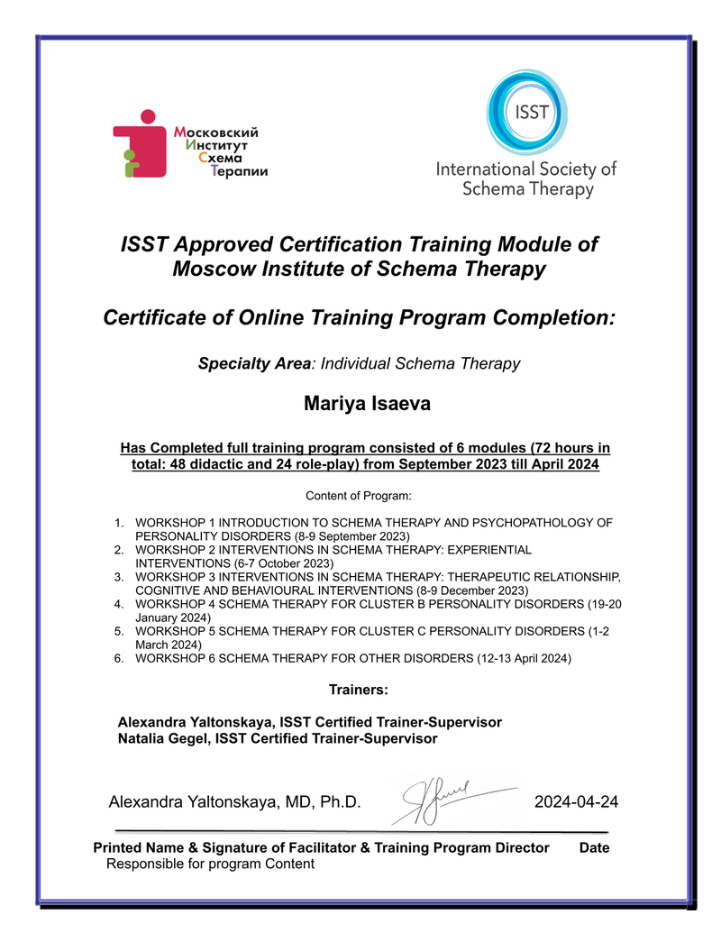 Моё знакомство с психологией началось ещё в школьные годы — с участия в Школе юного психолога при психфаке МГУ. Уже тогда стало ясно, что помогать людям понимать себя и справляться с трудностями — моё призвание.