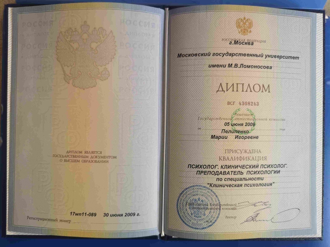 После школы я поступила на факультет психологии МГУ имени М.В. Ломоносова и в 2009 году окончила кафедру нейро- и патопсихологии по специализации «Клиническая психология».