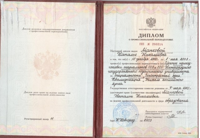 2000-2003 Нижегородский государственный педагогический университет им. Козьмы Минина. Учитель иностранного языка.