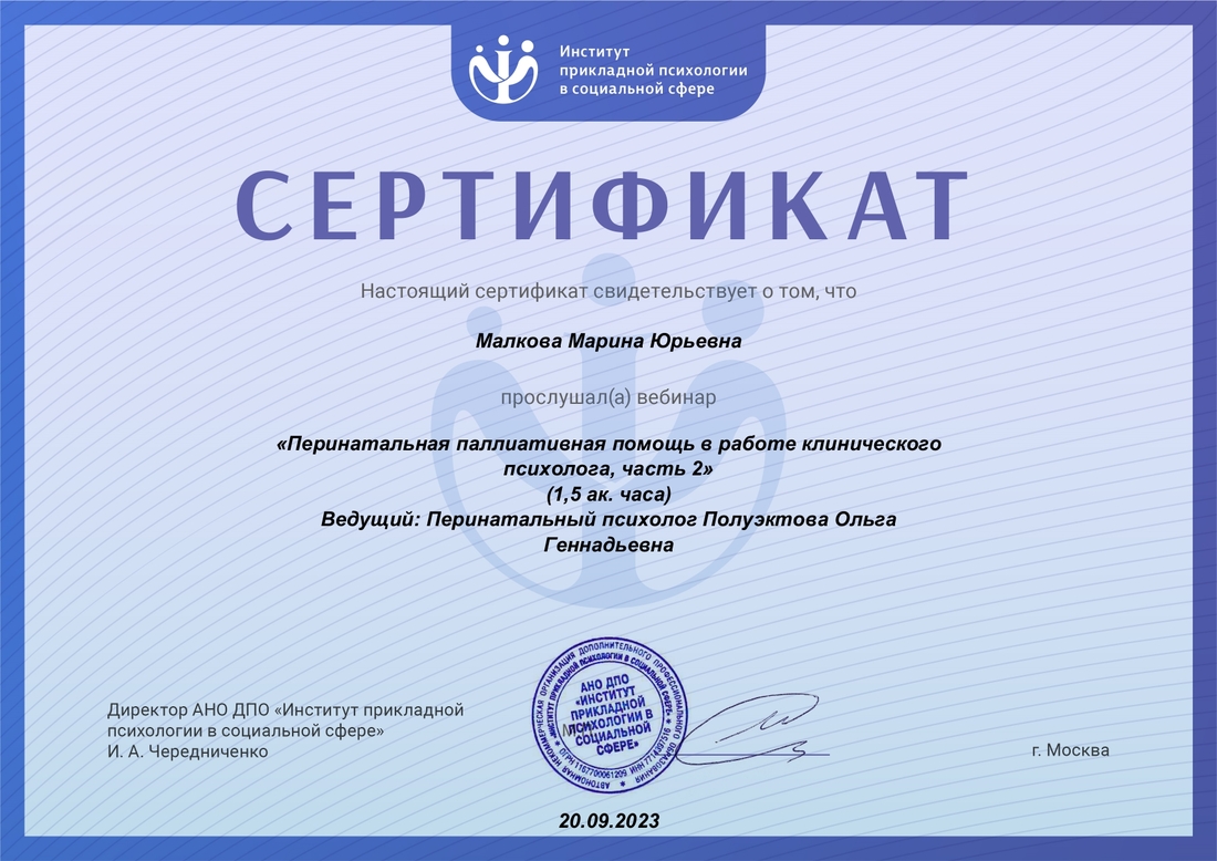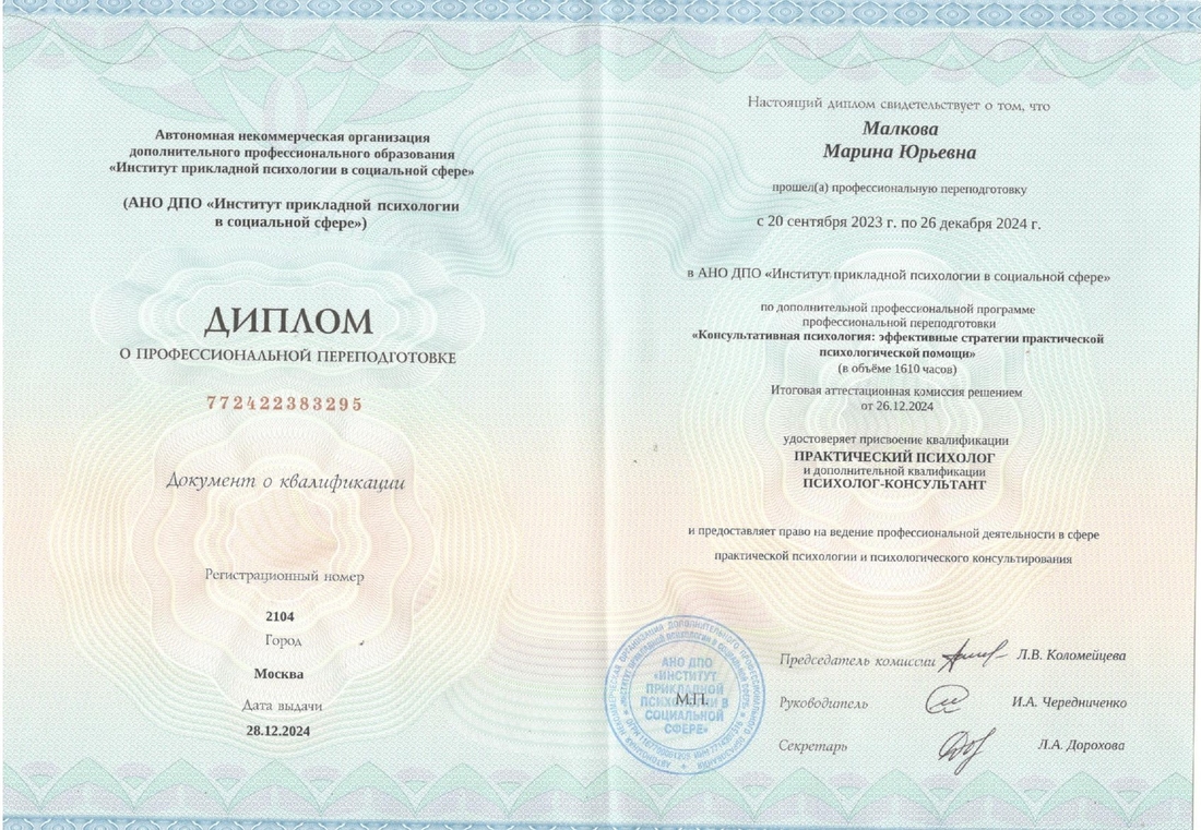 Меня зовут Марина. За плечами у меня не только профессиональный опыт, но и жизненный путь, который сформировал меня как специалиста и человека. Я прошла через три брака, из которых уходила сама, и сегодня счастлива в последнем, где научилась строить отношения на взаимных уважении, любви и поддержке. Мой личный опыт помог мне глубже понять сложности семейных отношений и найти пути их гармонизации. Для меня важно принимать друг друга такими, какие мы есть, без попыток изменить — если хочется изменить человека, значит, это не твой человек.