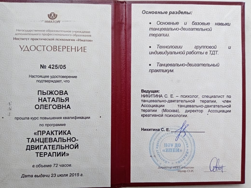 Люблю групповые методы работы. Провожу групповые занятия развивающие двигательные навыки и навыки саморегуляции физической и психической. Есть несколько программ женских групп по самопознанию с техниками арт-терапии и телесной терапии. Провожу психологическую группу мам с дочками "Дочки-матери".