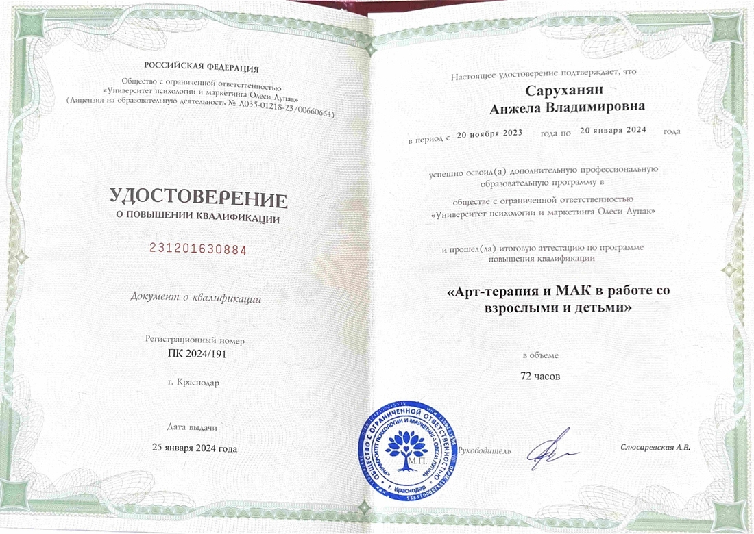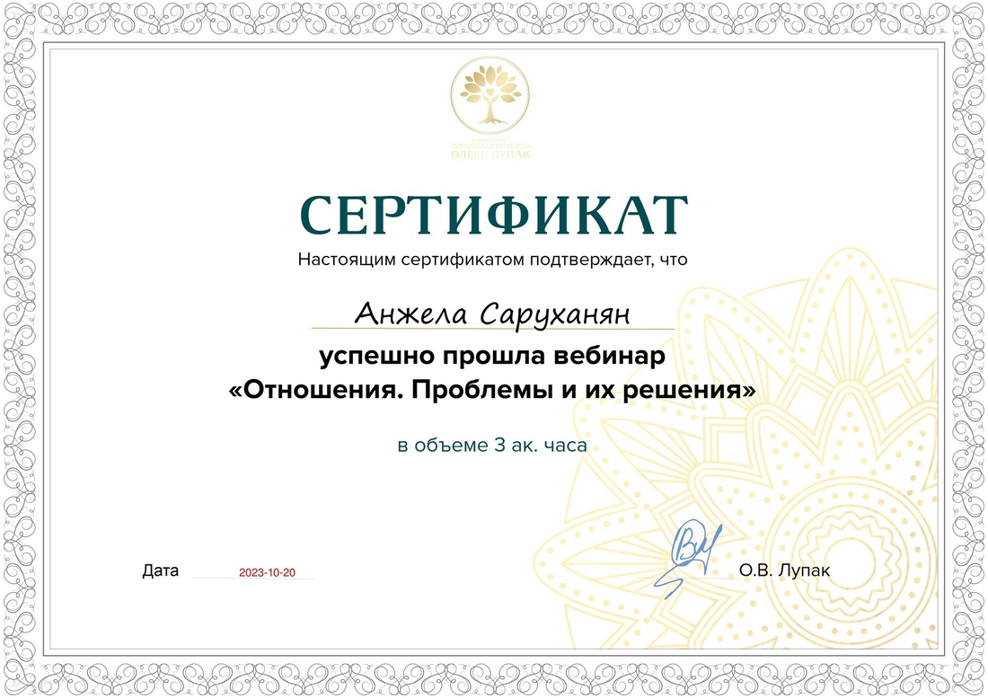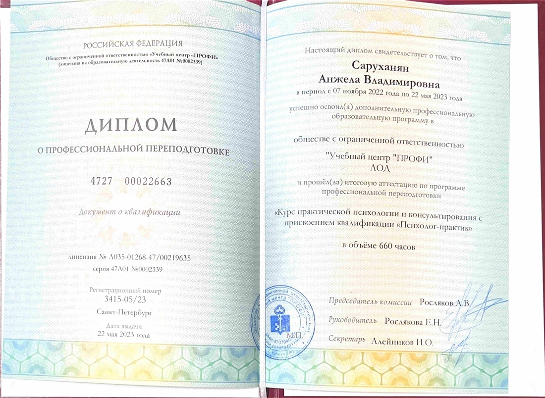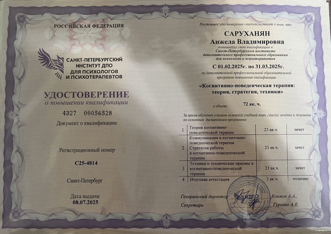 Я постоянно обучаюсь , чтобы быть в курсе новейших исследований и методов в психологии. Я знаю, что у каждого человека есть потенциал для изменений, и моя задача - помочь раскрыть этот потенциал.
