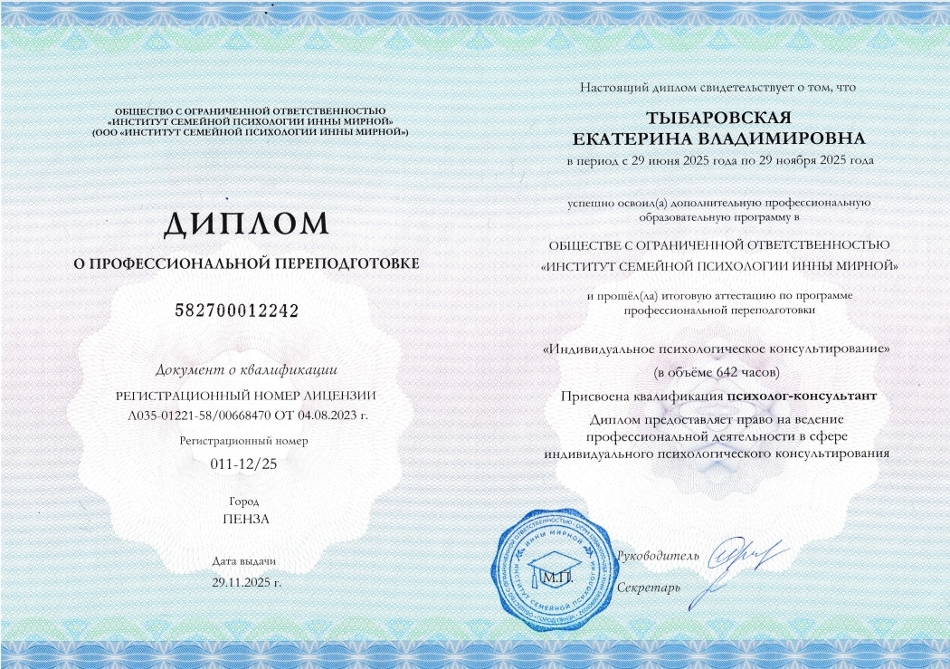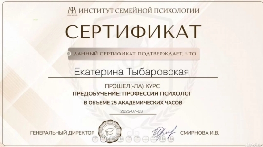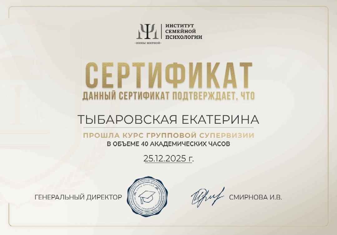 Меня зовут Екатерина Тыбаровская. Я психолог. Моя специализация — помощь взрослым, как и вы, преодолеть именно такие сложности и обрести контроль над своей жизнью. Я не даю абстрактных советов. Я предлагаю системную работу на результат.